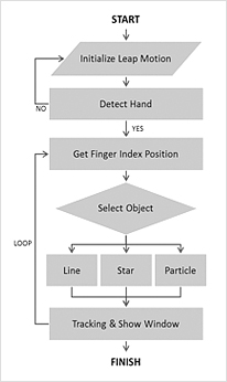 - Leap Motion을 이용하여 사용자 손의 검지 좌표값을 인식하고, 값의 변화에 따라 영상 내에 Line, Star, Particle과 같은 요소를 출력하는 프로그램을 개발함으로써 사용자 인터랙티브한 미디어 아트 구현.