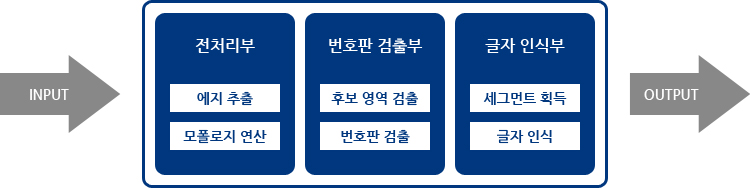 - 입력된 영상으로부터 번호판 후보 영역들을 검출한 후, 번호판이 아닌 물체들을 필터링하여 진입 차량의 실제 번호판을 검출한다.